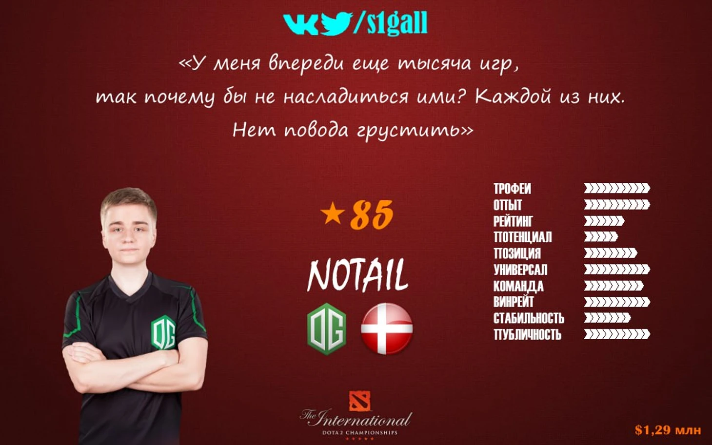 Легендарный датчанин сейчас переживает пик своей карьеры. Для полного счастья ему не хватает только победы на The International. Четыре мэйджора – хорошо, конечно, но ничто не может сравниться с чемпионским Аегисом. Notail никогда не унывает и верит, что однажды исполнит свою мечту.