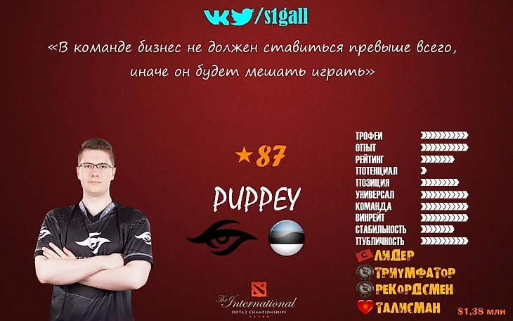 Puppey — настоящий первопроходец в Dota 2. Он в числе первых выиграл The International, первым из профессиональных игроков создал свою собственную организацию и первым сумел выиграть оба турнира Valve. Осталось только первым выиграть второе чемпионское кольцо, чтобы стать абсолютным боссом среди боссов доты.