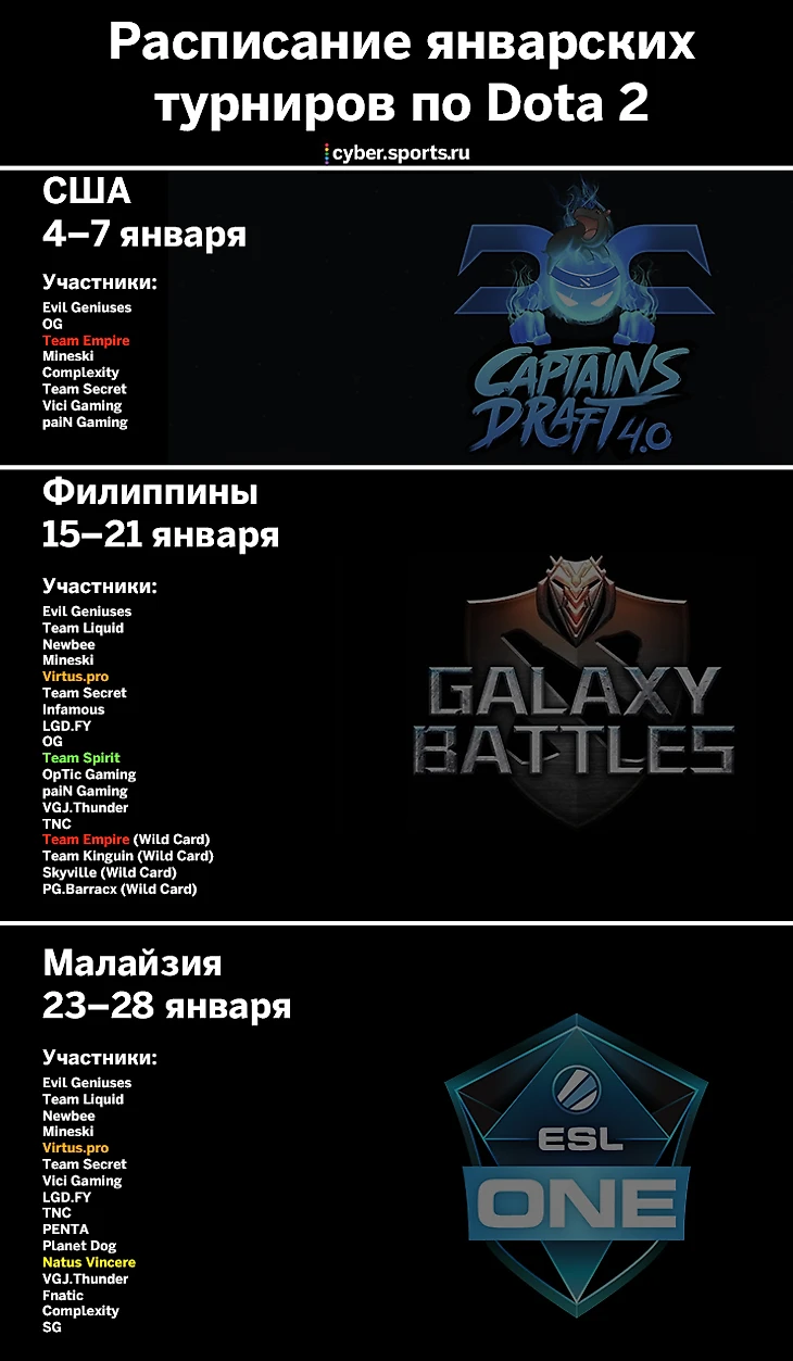 Нет времени отдыхать. Вечером 4 января продолжится рейтинговый сезон доты. В январе нас ждут майнор Captain’s Draft (300 тысяч долларов, 900 очков, Pangolier и Dark Willow в пике), мейджор Galaxy Battles (1,5 миллиона долларов, 4500 очков, огромная Philippine Arena) и майнор ESL One Genting (400 тысяч долларов, 1200 очков, Na’Vi).