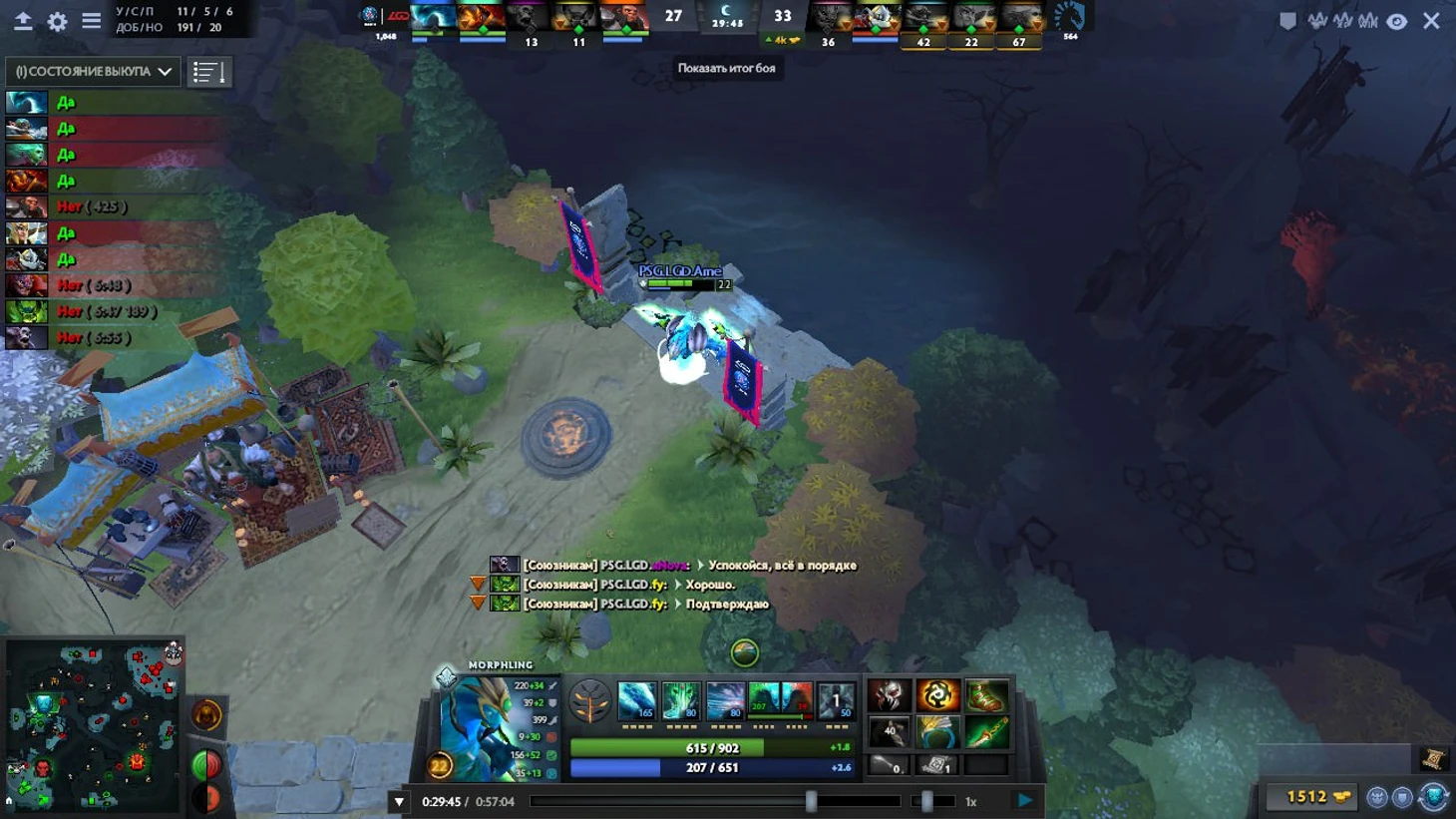 Затем уже PSG.LGD решили пойти в смоках и убили Ская. По непонятным причинам GH тут же выкупается, и Team Liquid принимает драку, хотя они могли просто окопаться на хайграунде. В этой драке погиб и Клокверк, который тоже тратит байбэк. Ликвиды после двух выкупов делают важный фраг на Морфе, но все ресурсы потрачены.