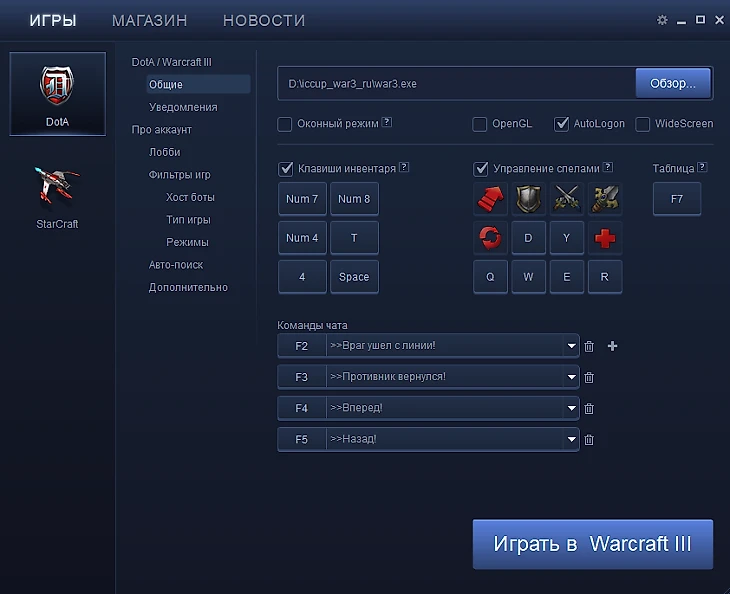 А вот программа запуска Варкрафта сильно порадовала. Настраиваемые клавиши инвентаря и способностей, а также команды чата, которых так не хватало! В общем, в этом аспекте iCCup прибавил, и это радует: