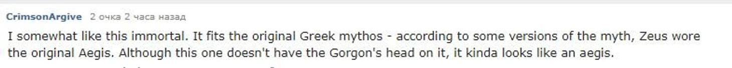 «А мне нравится эта Имморталка – она напоминает греческие мифы. Согласном одному из них, Зевс носил при себе самый настоящий Аегис. Хотя на этом щите и нет головы Горгоны, но он все-таки похож на тот самый из легенды».