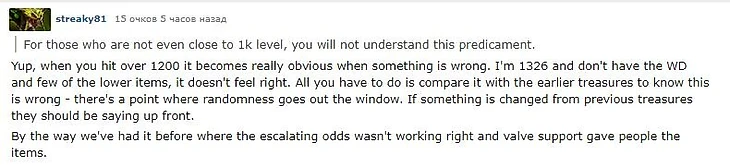 «Когда у тебя больше 1200 уровней, становится очевидно – что-то не так. У меня 1326-й, и у меня до сих пор нет Вич Доктора и еще парочки менее редких предметов. Чтобы понять, что именно не так – вам просто нужно сравнить происходящее с сокровищницами, которые выходили до этого. Случайность вышла из под контроля. Если шансы поменяли специально для этого сундука – они обязаны сказать об этом в открытую.