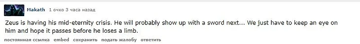 «У этого Зевса – кризис среднего божественного возраста. Сначала щит, потом ему подавай меч... Нужно приглядывать за ним и надеяться, что это все пройдет, пока он не лишился какой-нибудь своей конечности».