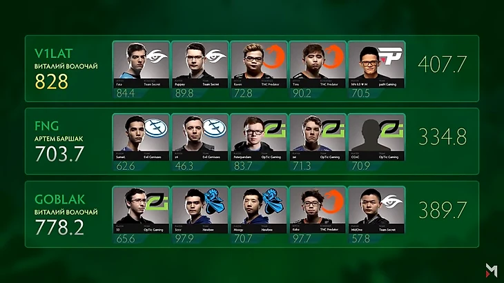 По итогам двух дней в противостоянии двух опытных профессиональных игроков и комментатора с примерно 3к ммр лидирует последний. Да-да, v1lat очень неплох в составлении dream team:
