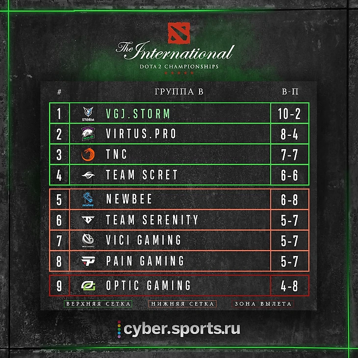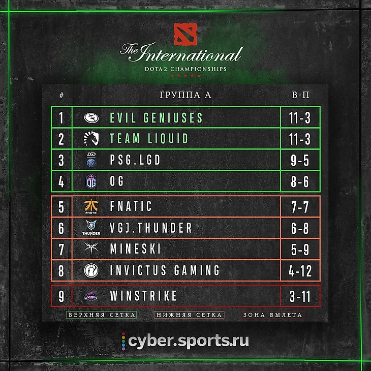18.08 19:00. Группа В. Vici Gaming – Virtus.pro18.08 19:00. Группа В. Team Secret – TNC 18.08 21:30. Группа А. PSG.LGD – Mineski18.08 21:30. Группа А. Evil Geniuses – Fnatic18.08 21:30. Группа А. OG – Winstrike19.08 00:00. Группа В. Virtus.pro – VGJ.Storm