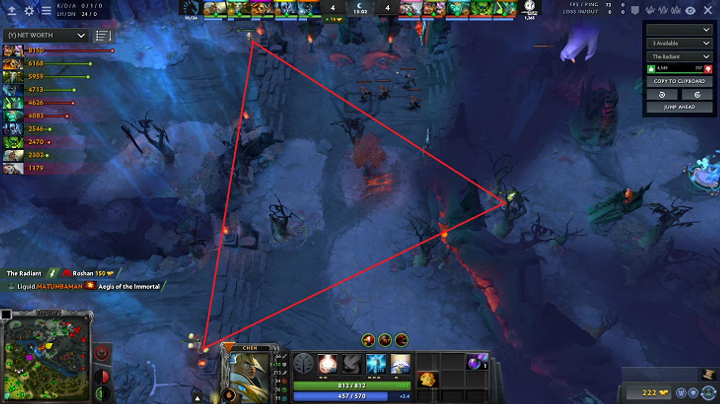 И снова TNC в списке, в частности – kuku. Нижний фонтан Radiant очень сложно завардить так, чтобы не подставиться под шальной Sentry. Считаю, что данная точка – одна из самых трудных для обнаружения.