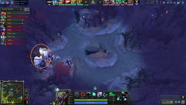 Возвышенность над т1 Dire – вечное место битвы саппортов. Чтобы избежать очень популярной сентри, TNC решила поставить обсервер прямо в лагерь древних крипов. Обычно варды в лагерях легко девардятся, так как отсутствие нейтралов выдает о наличии варда соперника. Но если речь идет о древних крипах, то на ранней стадии игры мало кто может с ними совладать – следовательно, такие варды найти очень и очень трудно.