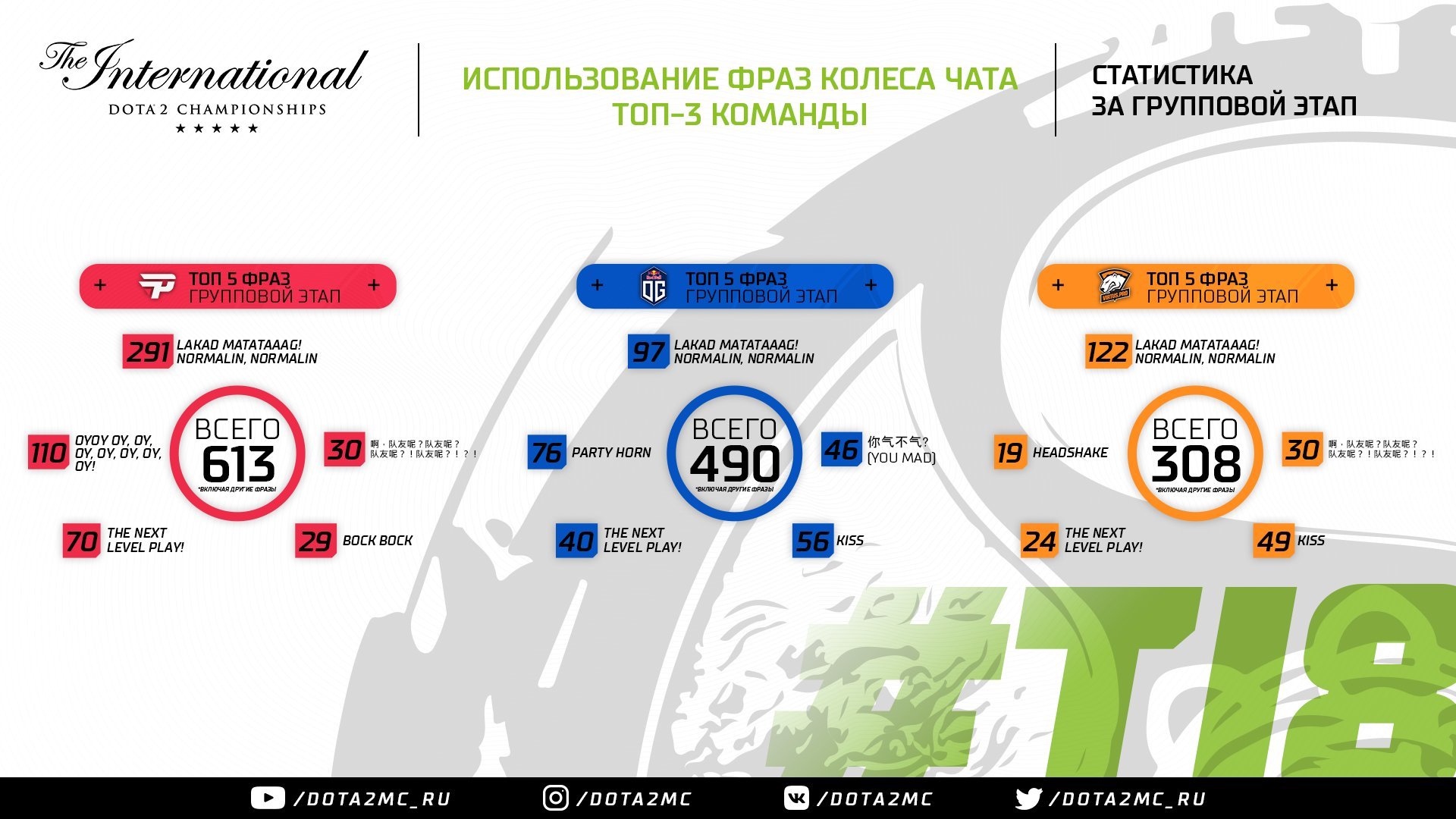 В твиттере студии Maincast выложили статистику главных спамеров «Lakad Matataag» и других надоедливых фраз во время игры. На первом месте расположилась команда Pain Gaming, и это вполне очевидно – если вы видели хоть одну их игру, то знаете, как часто бразильцы открывают голосовое колесо чата. К сожалению, Pain уже вылетела с турнира – теперь их могут догнать другие команды. Ближайшим преследователем сенсационно стала команда OG, которая единственная из всей тройки использует звук «Party horn». Замыкают тройку Virtus.pro – кто-то сомневался, что их не будет в этом топе?
