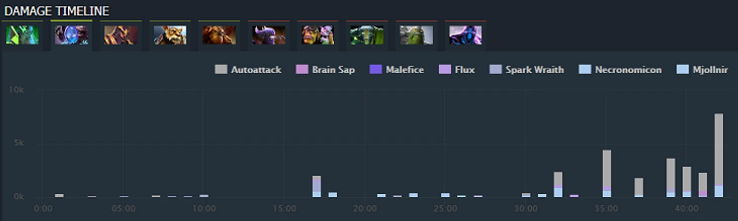 Артур довольно долго разгоняется. Примерно так выглядит его стандартный таймлайн по урону.