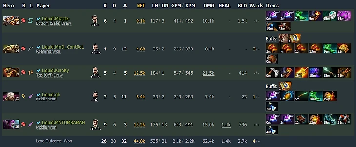 Игра получилась недолгой. В один момент Team Secret забрали Рошана, и за один заход уничтожили всю центральную ось зданий Team Liquid, включая Трон.