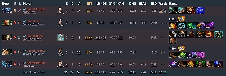 У Team Secret был упомянутый выше KotL с Рефрешером первым артефактом, и Enchantress с билдом Midas – Tranquil Boots – Shadow Blade.