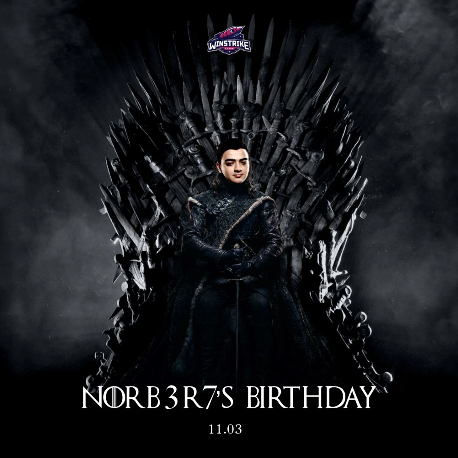 Отправить гонцов во все 7 королевств! Сегодня у нас праздникСвой день рождения отмечает самый юный представитель семьи Winstrike Team – n0rb3r7. Сегодня ему исполняется 18, а это означает, что теперь ему можно водить машину, самостоятельно ездить заграницу и, конечно же, претендовать на железный трон!