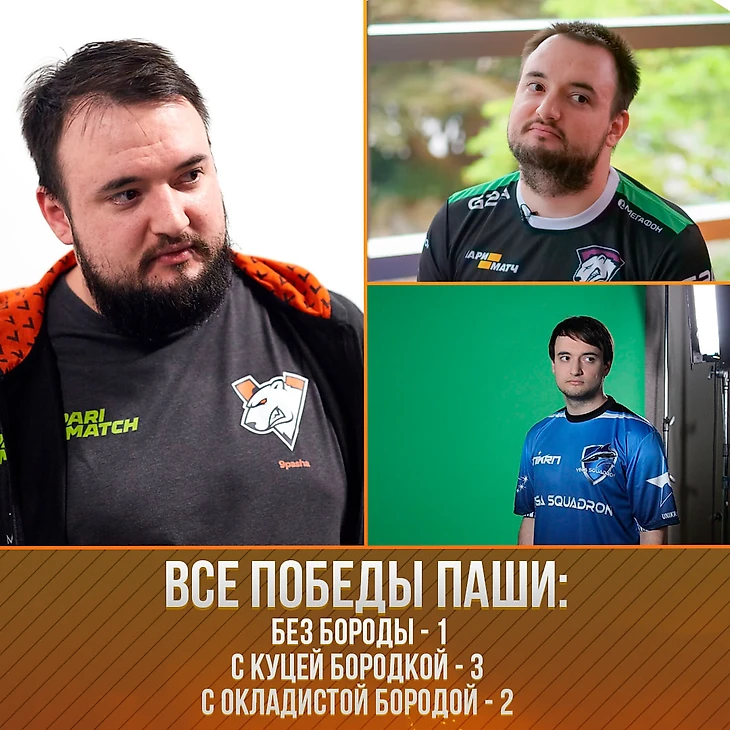 Вега вышла в Wild Card, а Паша остановился на короткой щетине. Затем были Polarity, Fantastic Five, переход в Virtus.pro. Менялась форма, позиция в команде, но не растительность на лице Паши: иногда он позволял себе трехдневную щетину, а в основном был гладко выбрит.