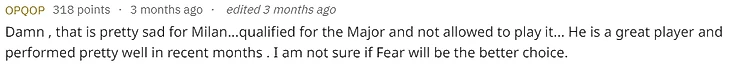 «Черт, мне так жаль Милана... Отобраться на мейджор и не поехать на него... Он великий игрок и исполнял очень здорово в последнее время. Не думаю, что Fear станет лучшим выбором».