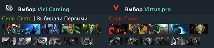 Первые 3 пика у обеих команд были довольно стандартные. Вичи открылись метовыми Ораклом и ЕСом, которые позволяют проводить стадию лайнинга активно: эти 2 героя позволяют как напрягать врагов на боковых линиях, так и выходить гангать в мид. Также китайский коллектив взял Венгу, которая хорошо себя показала против Fnatic и PSG.LGD. ВП же начали с полюбившегося им по ходу турнира Разора, метового Расты и ШД, которого команда также активно использовала. Далее Виртуса добрали Тайдхантера, чтобы усилить драку, однако его пик можно считать достаточно противоречивым, поскольку Тайда обычно берут, чтобы напрягать милишных коров соперника, а у Вичи таковых не было. Однако на последние 2 пика оппонента Арсзику и Рамзесу удалось ответить Лансером, который очень неплохо заходил. В целом не так был плох драфт ВП, но с самого начала у них начались проблемы.