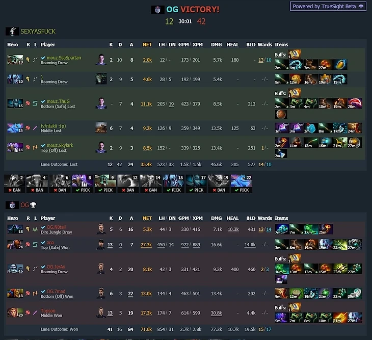 Игра закончилась на 30-й минуте, а перевес OG по золоту составил 35 тысяч. Итоговый счет Анатана – 13/0/7.