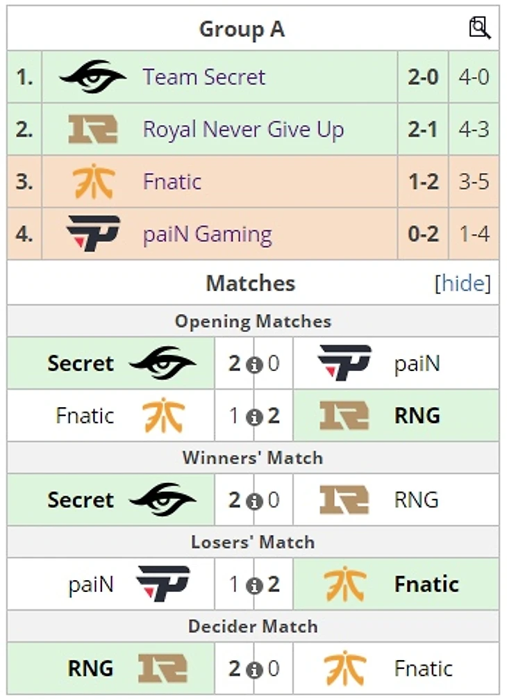 В этой группе без сомнений Team Secret заняли 1-е место. За 2-е место, как я и говорил была острая борьба между Fnatic & RNG, Однако, если смотреть на результат, Fnatic выиграли из 5 карт в этом противостоянии только одну единственную, самую 1-ую у китайского коллектива. Не жду от них больших свершений в плей-офф, так как сыграют с 4-м место группы C и вероятнее всего проиграют любой из этих команд в bo1, если только Dj или Abed не затащит их. PaiN заслуженно 4-е место, без комментариев, но в плей-офф в bo1 Южная Америка часто выстреливала. Вспоминаем "успехи наших команд" на мажорах против этого региона.