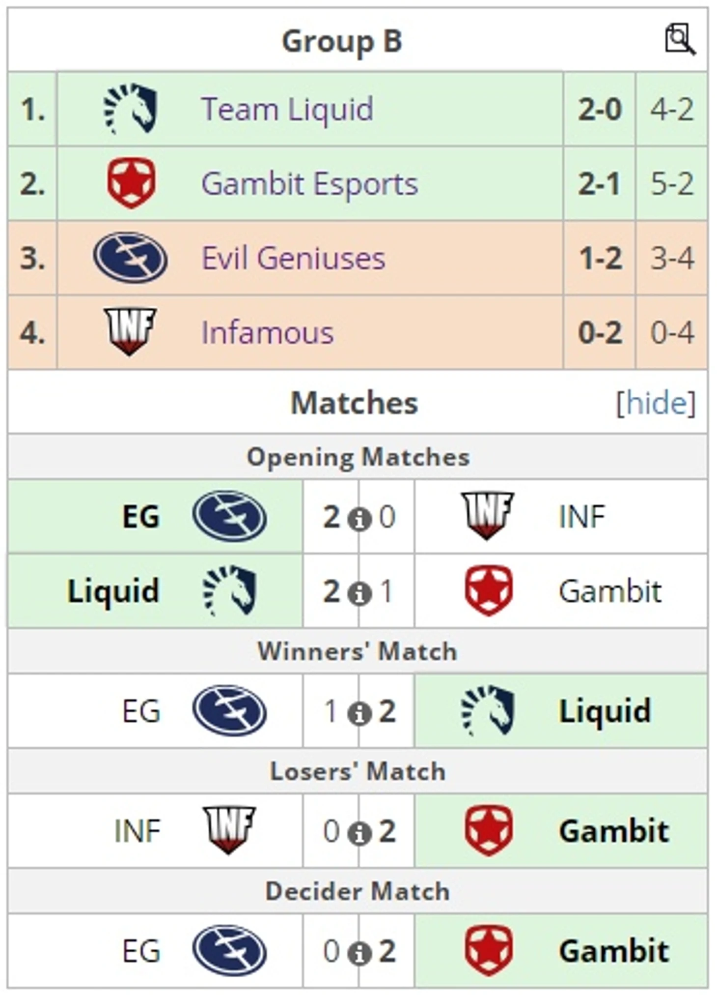 Для меня с одной стороны провал Evil Geniuses оказался неожиданным, а с другой вспоминаешь их групповые этапы на многих турнирах, и кажется уже обыденным такое выступление. Но было это слишком жёстко, настолько они скатились после 1-й карты с Liquid, каждая из 4-х последующих карт была хуже и хуже. Апофеозом всего этого стало - поражение от Gambit и 3-е место в группе. Team Liquid - молодцы, как и Gambit, достойно заняли 1-2 место. Infamous не повезло оказаться в группе смерти, закономерное 4-е место.