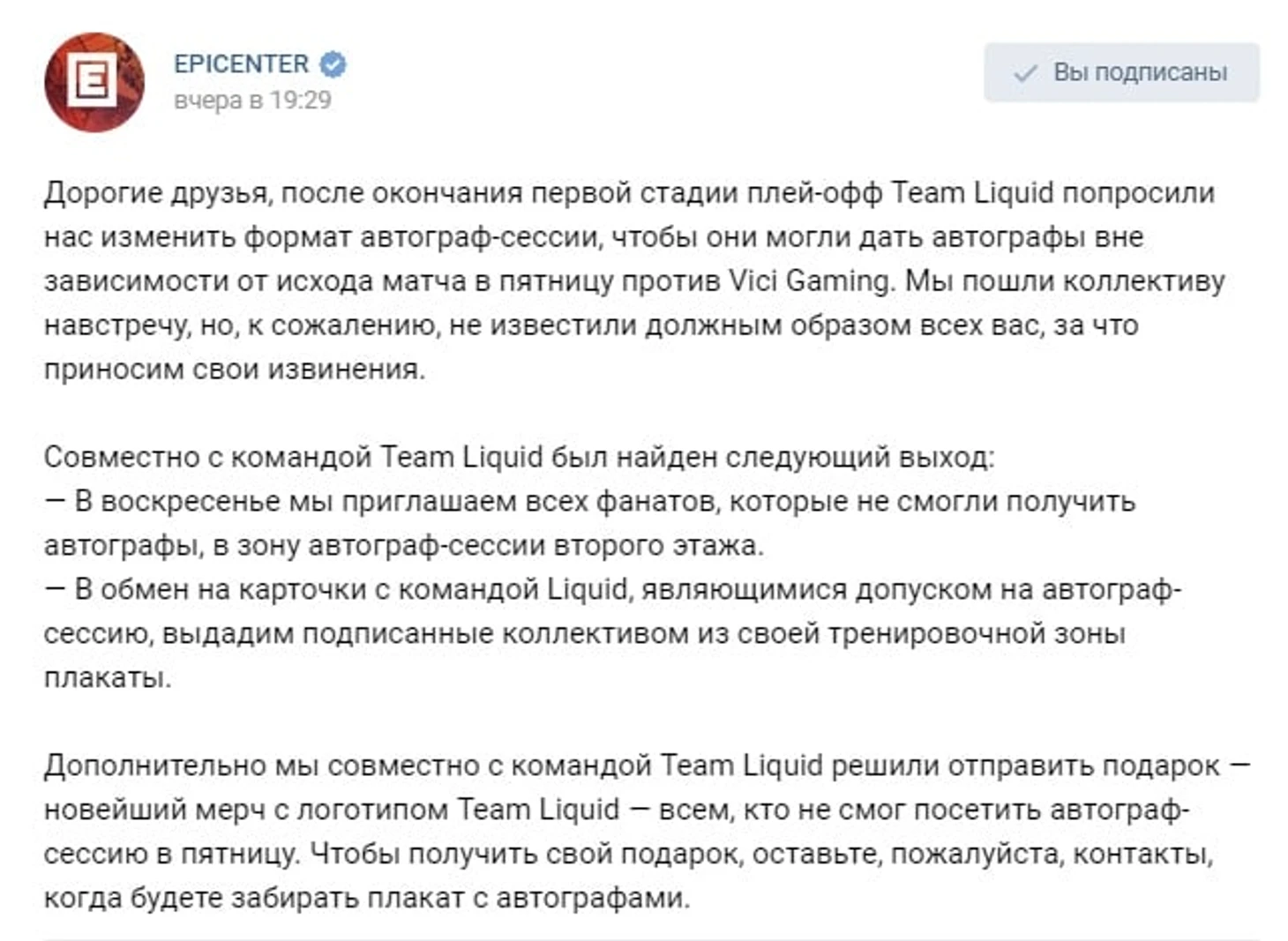Вечером в группе Epicenter организаторы рассказали, что вместе с Liquid нашли альтернативный выход из ситуации. Все фанаты, которые не попали на автограф-сессию получат новый мерч команды.