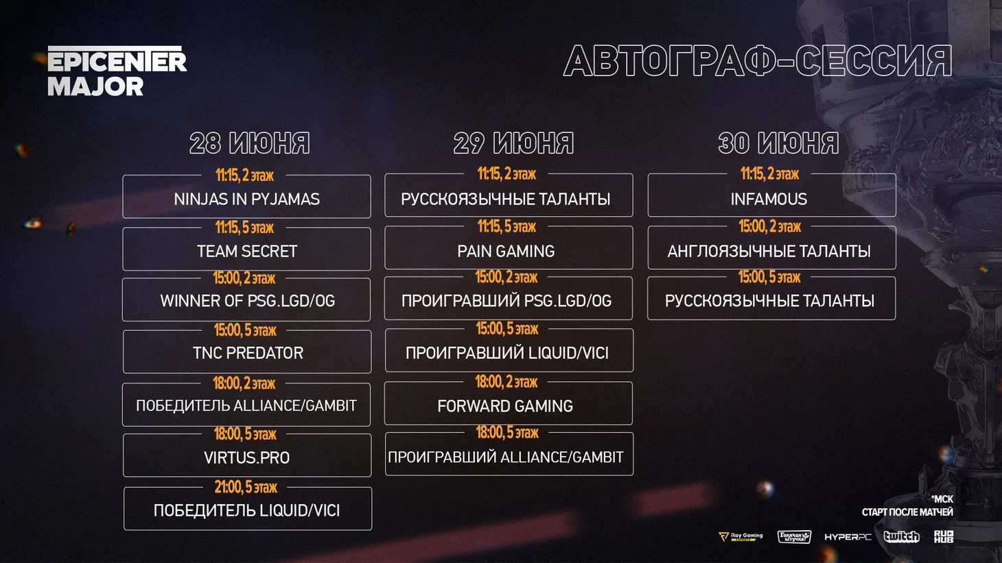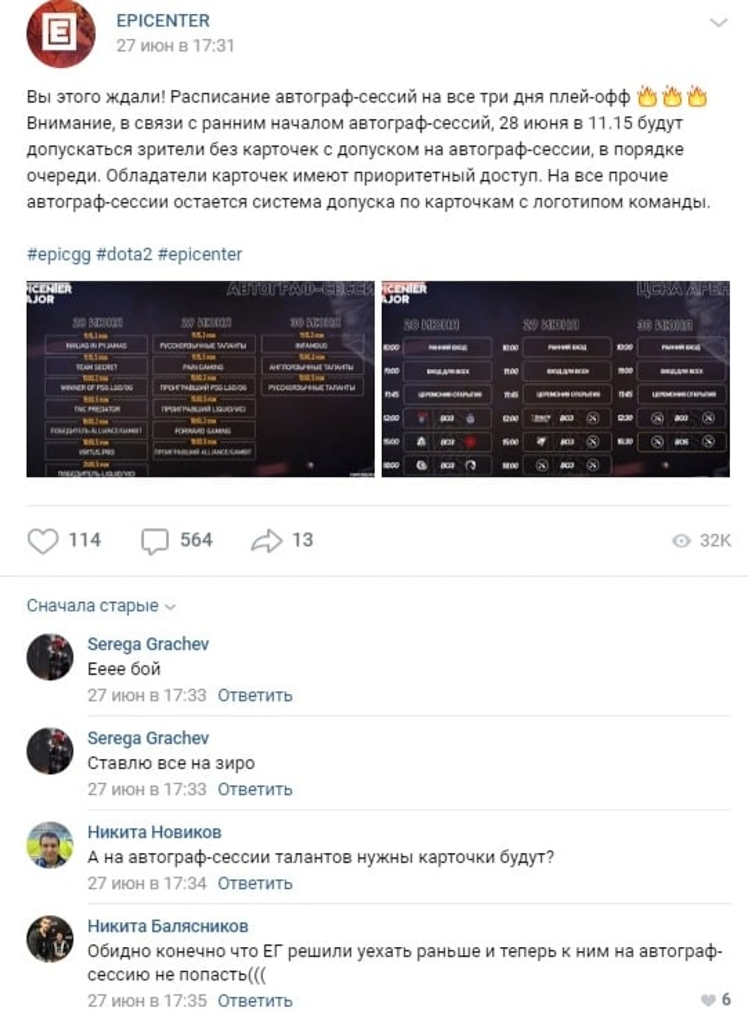 После окончания вчерашнего матча Liquid – Vici Gaming организаторы объявили, что автограф-сессия с Liquid перенесена на время после матча (пятницу) вместо изначально заявленной субботы. Было поздно, и многие зрители уже ушли и пропустили анонс, а тех, кто решил вернуться, обратно не пропустила охрана. Утром организаторы рассказали о ситуации и предложили фанатам замену – подписанные игроками плакаты. Если верить официальной группе Epicenter ВК, о переносе встречи с фанатами Liquid попросила еще после окончания первой стадии плей-офф, а организаторы пошли навстречу команде, но не известили об этом фанатов.