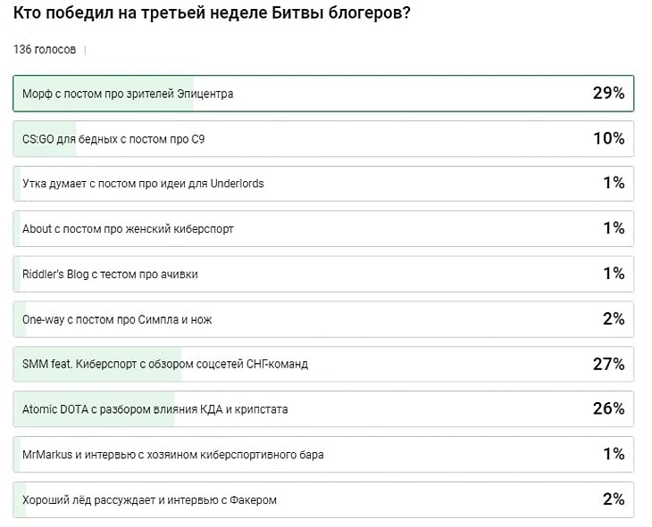 Чтобы сохранить армию подписчиков, которая вступила в группу из-за спортивных успехов организации, надо регулярно выкладывать материал. Самым активным SMM-щиком оказался представитель Team Empire, следом идут Virtus Pro, Natus Vincere, Gambit Esports, Team Spirit, Winstrike Team и замыкает рейтинг «большой семерки» контентщик Vega Squadron.
