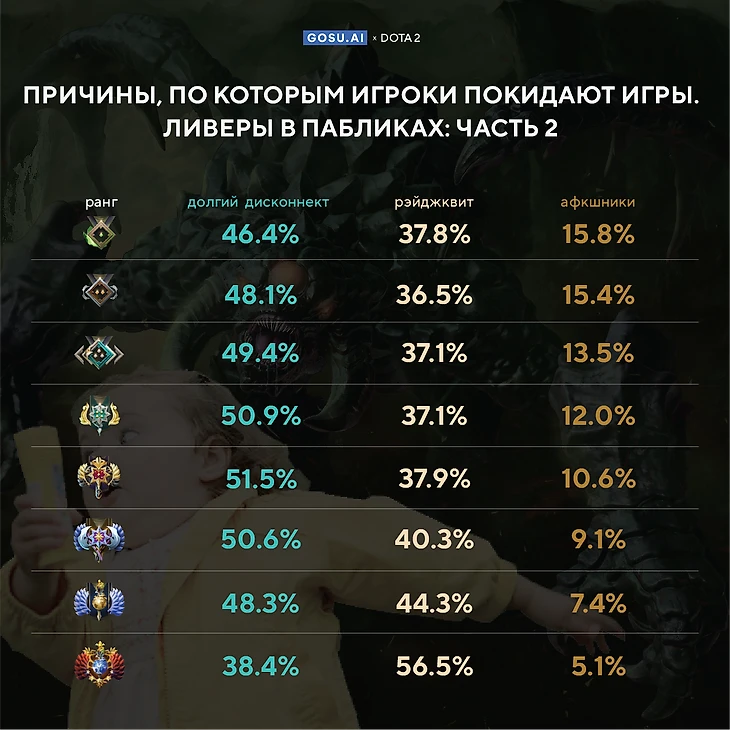 На прошлой неделе мы представили инфографику, на которой вы могли увидеть, что как минимум один игрок принимает решение «ливнуть» в одной из десяти игр. Данная статистика была основана на анализе более чем 50 миллионов игр, сыгранных пользователями GOSU.AI. Поскольку у вас было множество вопросов о причинах «ливов» игроков, мы подготовили вторую часть инфографики, в которой, мы надеемся, вы найдете для себя необходимые