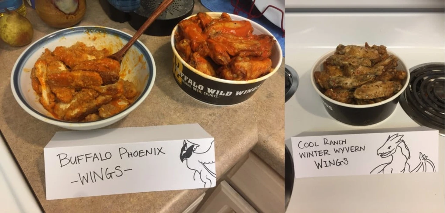 Очередной вариант крылышек – крылышки Феникса с соусом баффало и холодные крылышки Виверны.