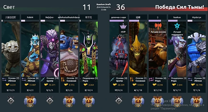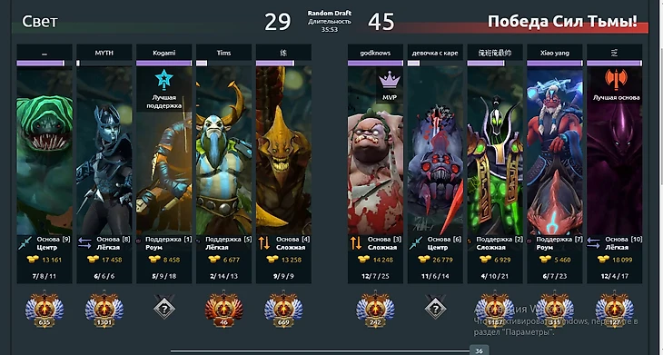 В зависимости от пика противника и старта игры билд выглядит так: Мидас/Медалька – Диффуза/Орчид – БКБ – Аганим. Он не покупает сапог, так как бонус к мувспиду по сеткам 70%, а с Аганимом и вовсе 100%.