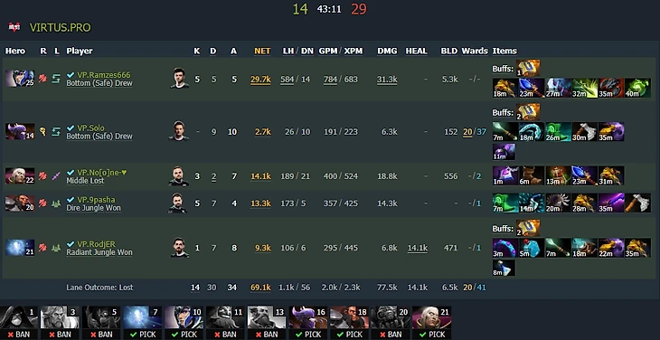 17/0/6 – обычное КДА для керри VP на этом герое. И это против Нуна на миде! На TI9 Нун и Рамзес еще ни разу не свапнулись линиями.