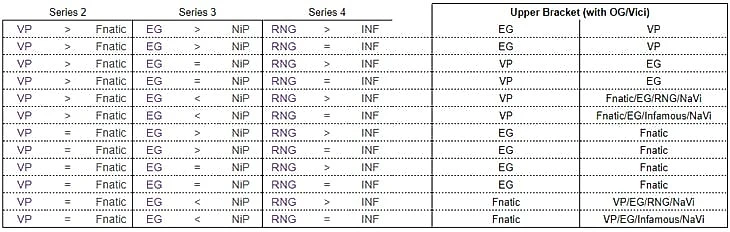 7:05. Noxville расписал ВСЕ 27 раскладов, которые могут произойти в группе B. Слева расположены потенциальные результаты, а справа – команды, которые в таком случае проходят в верхнюю сетку. Перечисление команд через дробь означает переигровки между ними.