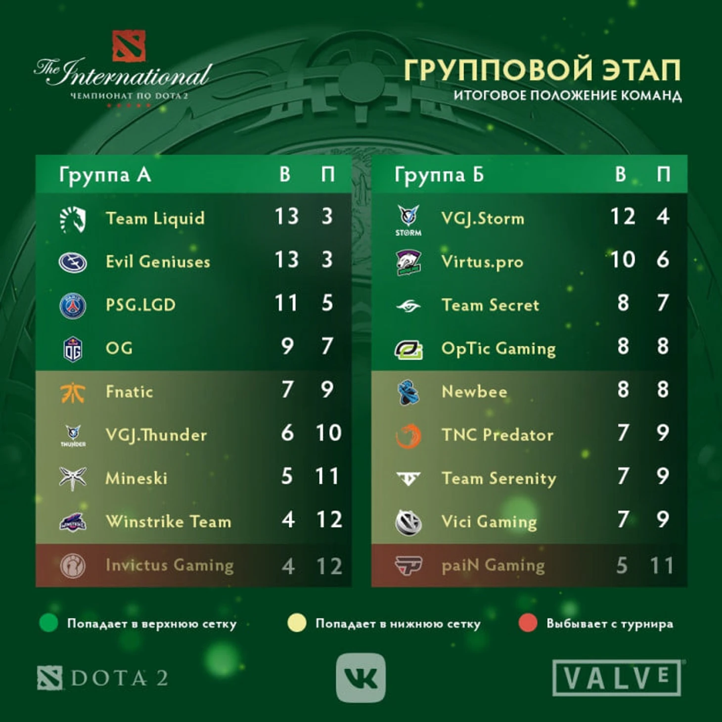 На групповом этапе команда Резоля уверенно прошлась катком по всем, кроме VP (последний матч, который уже ничего не решал). А вот у OG были проблемы: они всухую проиграли Liquid и Evil Geniuses и после второго дня шли на 7-м месте в группе. Но 5 выигранных в третий день карт из 6 помогли OG занять четвертое место.
