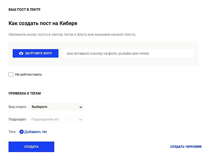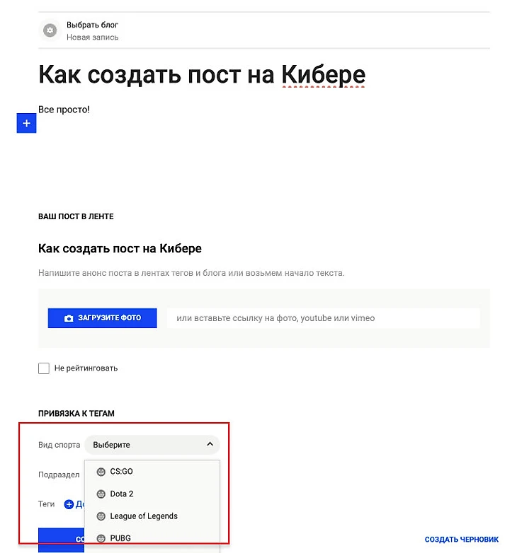 Вы попадете в редактор постов. Здесь можете выбрать блог для публикации или же оставить пост без блога. Учтите, что вид спорта выбрать все равно придется.