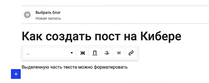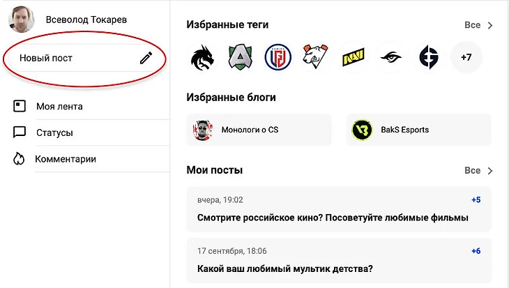 Еще вы можете создать пост без регистрации своего блога. Для этого наведите курсов на иконку своего профиля на Кибере и нажмите «Новый пост».
