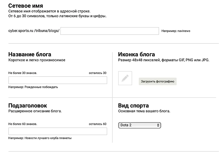 Вы попадете на панель регистрации. Заполните строку с будущим адресом блога, его заголовком, видом спорта и описанием – все эти элементы помогут будущим читателям лучше узнать вас и ваше творчество.