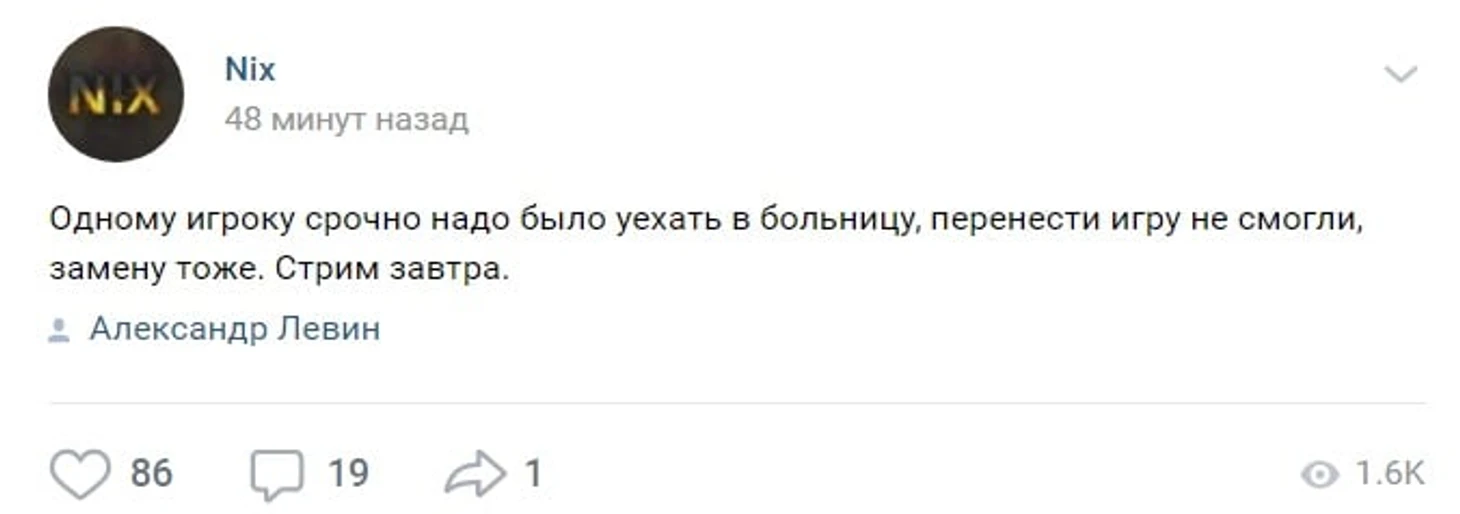 Мидер HellRaisers Александр «Nix» Левин написал в своей группе ВК, что одному из игроков HR срочно понадобилось уехать в больницу, найти замену в короткий срок или перенести матч не получилось.