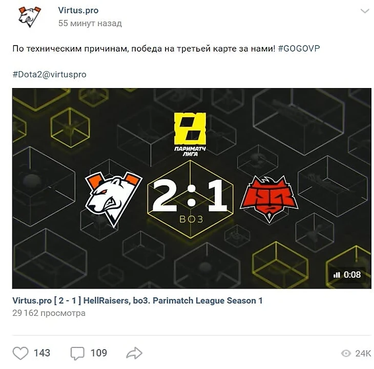 Тем временем соцсети Virtus.pro уже выпустили пост о победе команды: