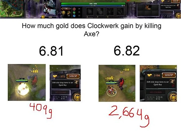 Еще никогда камбэки не были так реальны. Можно было запустить игру, уйти пить чай, вернуться, убить противника со стриком и выиграть. В Valve быстро поняли, что это несправедливо, и уже через три дня вышел патч 6.82b, а еще через две недели 6.82c, в которых баланс получения золота был изменен. В 8 раз. Можете поверить – или прочитать пруф ниже.