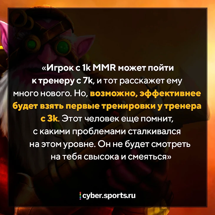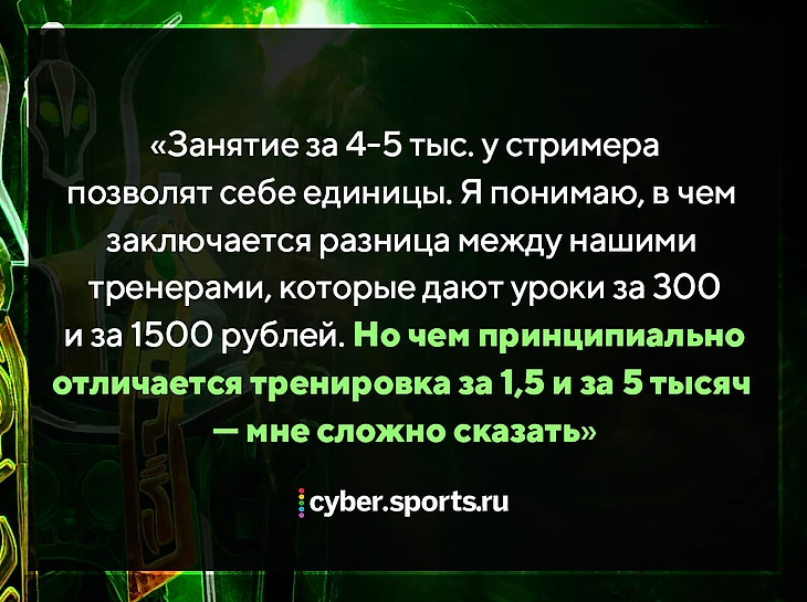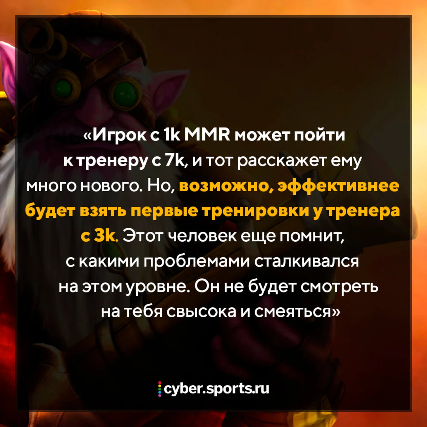«Тренер раз в неделю по часу рассказывал мне, как бить крипов и что-то про треугольник фарма. Когда я приходил на следующее занятие без особых продвижений по рейтингу, он начинал объяснять все заново», — уверяет Никита, стартовавший с 3,7k MMR.