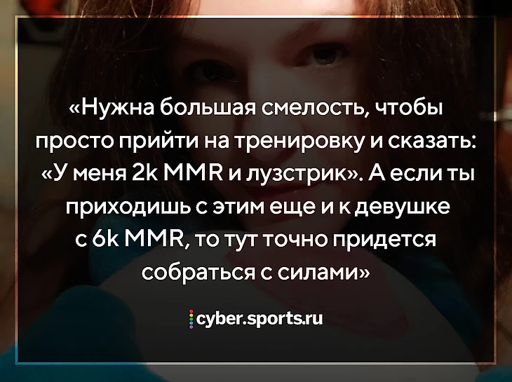 К тому же нужна большая смелость, чтобы просто прийти на тренировку и сказать: «У меня 2k MMR и лузстрик». А если ты приходишь с этим еще и к девушке с 6k MMR, то тут точно придется собраться с силами. Но когда это выйдет на профессиональный уровень, разницы не будет. Точно так же, как есть врачи женского пола — это тот же врач».