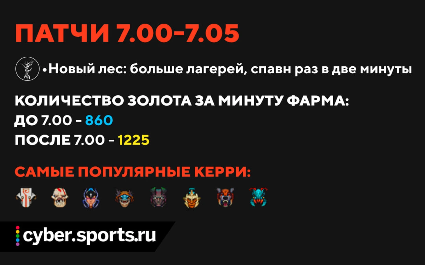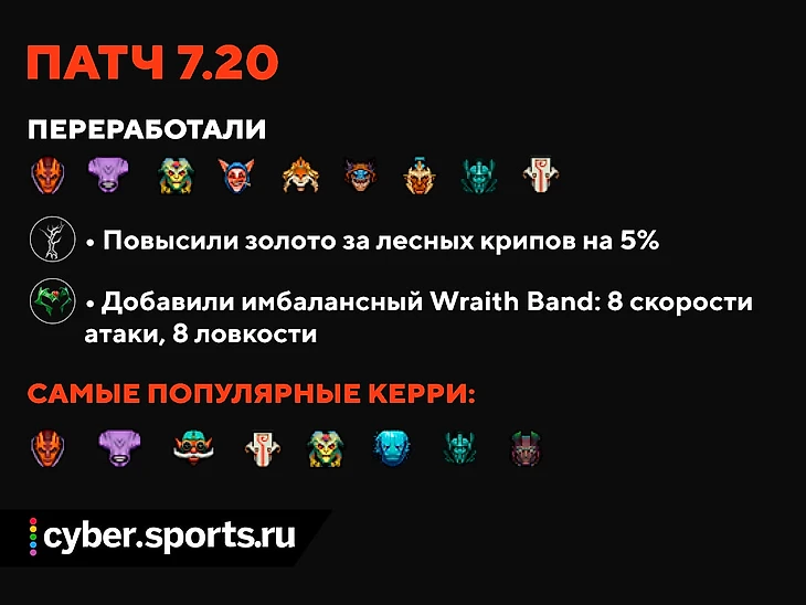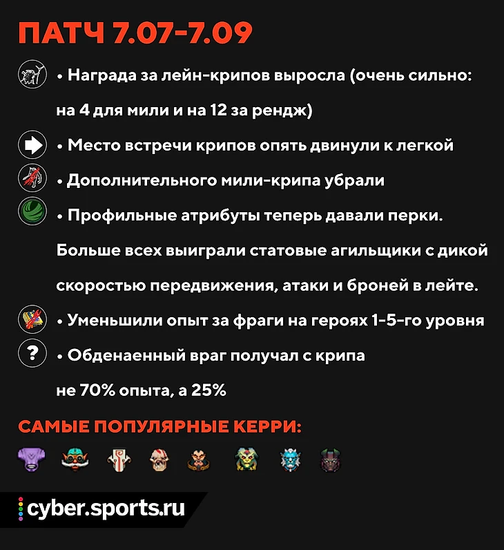Прочие глобальные изменения (урон вышек, место встречи крипов, награда за лейнкрипов) также замедлили игру и сделали игру хардкерри комфортнее. В итоге в мете появились даже герои, которых не усиливали напрямую – Джаггернаут, Сларк и та самая Спектра Бэдмэна.
