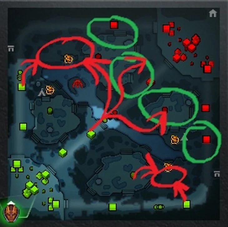 Также нужно отметить важность тир-1 вышки при игре с Алхимиком и против него. Красным отмечены зоны, которые Алхимику недоступны. Зеленым – относительно безопасные.