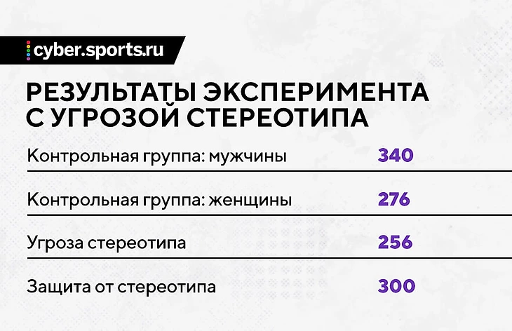 После прочтения сообщения участников и участниц отправляли играть в простейшую игрушку по собиранию монеток. Результаты говорят сами за себя: хуже всего с задачей справились девушки, которых запугали стереотипом о неумелых женщинах-геймерах. А вот те, кого заверили, что к ним подобные высказывания не относятся, показали результаты, близкие к мужской контрольной группе.