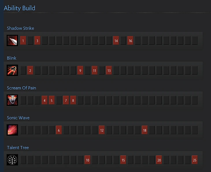 Shadow Strike - очень сильный инструмент для харасса врага на линии. Спелл накладывает назойливый эффект замедления и яда. Shadow Strike не стоит максить, но очень эффективно взять его в двоечку на третьем уровне персонажа, чтобы закрепить доминацию на линии.
