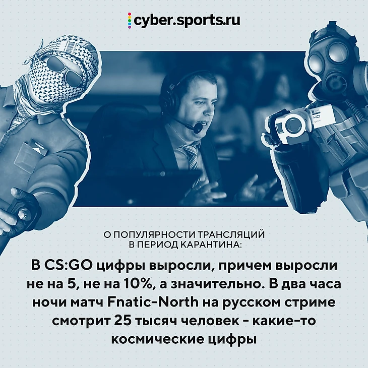 А в CS:GO цифры выросли, причем выросли не на 5, не на 10%, а значительно. В два часа ночи матч Fnatic-North на русском стриме смотрит 25 тысяч человек – какие-то космические цифры. Возможно, это всплеск популярности CS:GO в мире, потому что бьются все рекорды каждый день. Но скорее всего, это последствие и того, что люди сидят дома и им объективно нечего делать. Сериалы 24/7 смотреть невозможно, просто надоест. Поэтому и Доту смотреть будут больше.
