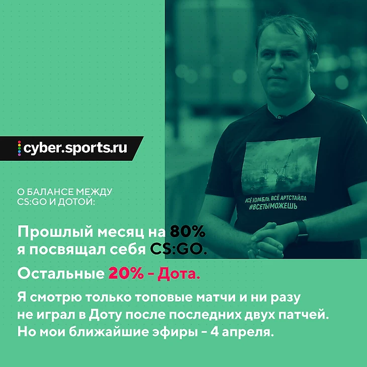Остальные 20% - Дота. Я смотрю только топовые матчи и ни разу не играл в Доту после последних двух патчей. Но я знаю, что ближайшие мои эфиры будут только 4 апреля. И вот за неделю до этого я опять перераспределю свой график. Наверное, теперь в день у меня будет уходить часов 6 на CS:GO и часов 6 на Доту.