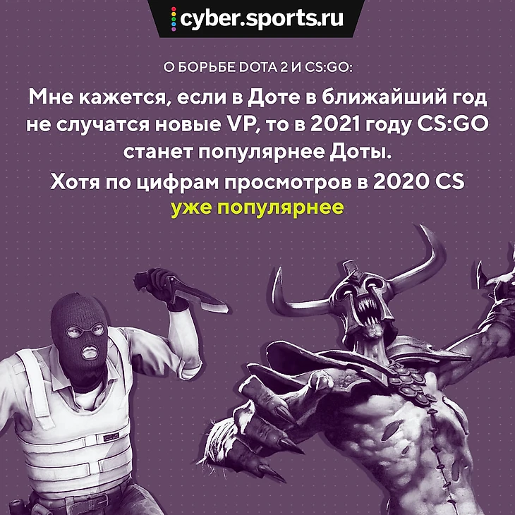 У Доты за последние много лет не было таких выдающихся результатов, как сейчас появляется у CS:GO. И тех надежд, которые дают сейчас каэсеры. Мне кажется, если в Доте в ближайший год не случатся новые VP, то в 2021 году CS:GO станет популярнее Доты. Хотя по цифрам просмотров в 2020 CS уже популярнее.
