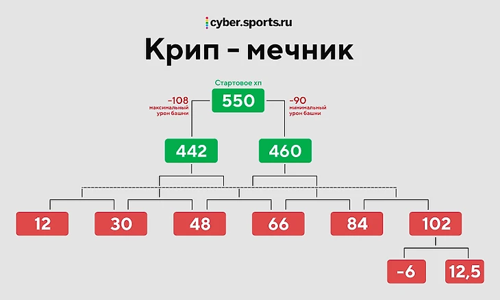Итак, после второго удара у нас есть три разные ветви древа. Нас интересует развитие всех ветвей «вправо», в сторону минимального урона. Именно крайняя правая ветвь приводит к ситуации, когда у крипа остается максимум здоровья и он может пережить 6-й удар башни. Наша задача – заранее увидеть развитие «вправо» и избежать его. А значит, нас интересуют значения от 352 (550-90-108) до 370 (550-90*2). Но мы должны скорректировать ХП крипа так так, чтобы после нашего удара ситуация не стала еще хуже.