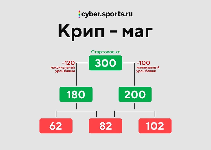 Вышка бьет крипа минимум на 100 здоровья, максимум – на 120. И накидываем сверху ХП-реген. Получается, что минимально после двух ударов вышки у крипа-мага останется 62 ХП, а максимально – 102. Разумеется, оба крайних варианта практически нереальны. Но примерные риски вы можете себе представить.