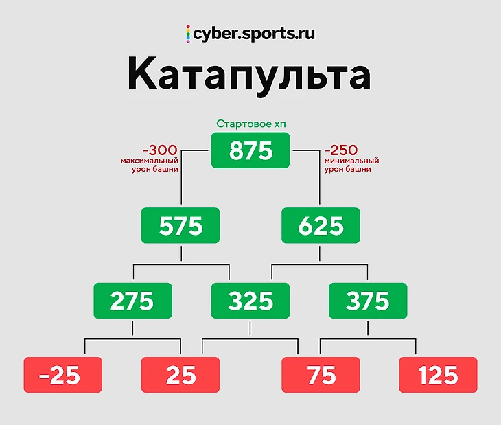 Имеет 875 хп и 0 брони. Вышка наносит катапульте на 150% урона больше, чем героям и крипам. Поэтому разброс урона будет не 100-120, а 250-300. Для уничтожения катапульты вышке потребуется 3-4 удара. Самый рандомный крип. Разброс урона башни по катапульте – 50, что очень много. Это приводит к разбросу в целых 150 урона после трех ударов вышки.